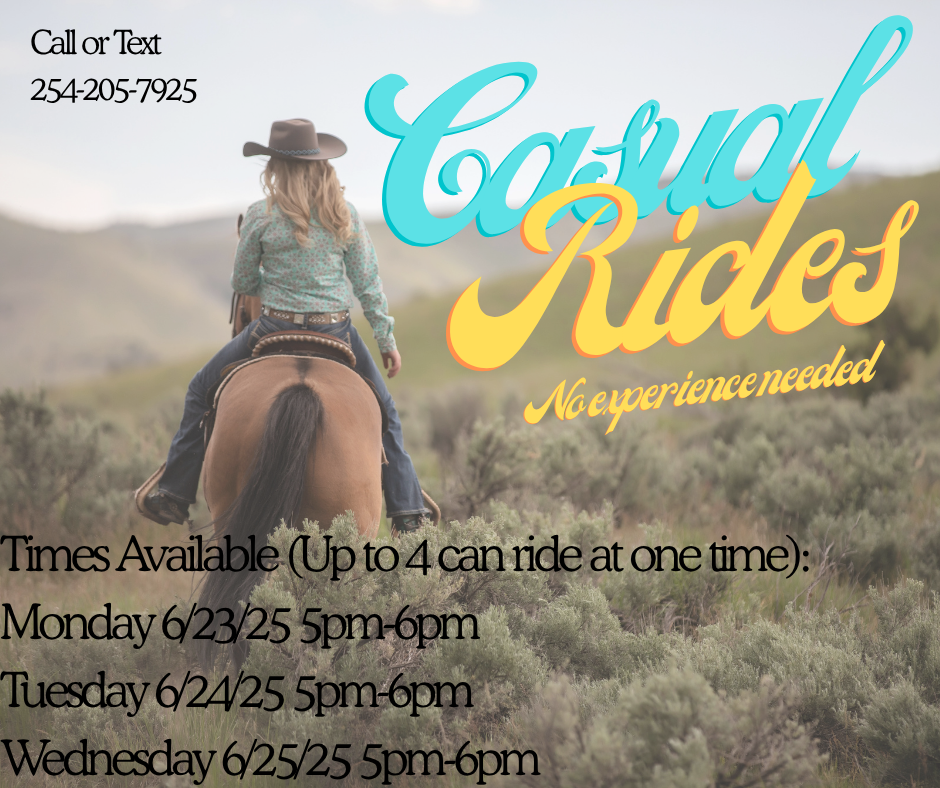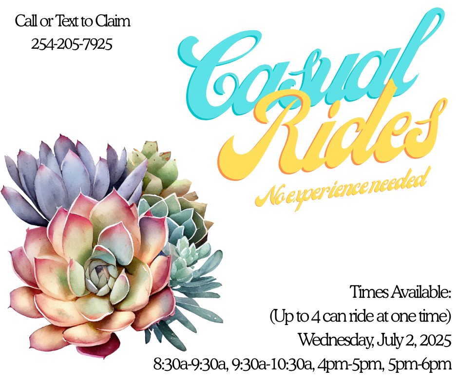 If you choose to ride with us, you will need closed toed shoes. These are required. Flip flops & crocs are not allowed and are subject to a cancellation. We will ask you to spit out any chewing gum while we ride; it can be a choking hazard. Helmets are required. We do provide helmets if you do not want to purchase your own. If you choose to bring your own, they must be equestrian style with occipital bone protection. Tank tops are okay, not preferred, but are allowed as long as their straps are 2” or wider. Shorts are okay, it is Texas. It gets hot. Shorts must have a 5” inseam at minimum. Please bring sunscreen, bug spray, bottle of water, or a jacket as needed.